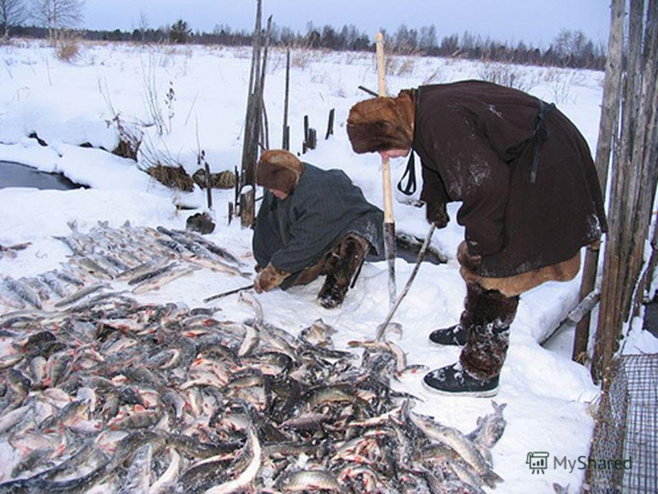 Многочисленные способы рыбалки зависят от места ловли, сезона, повадок рыбы. В мелких протоках ханты ставят плетеные ловушки, сети и загражденья из кольев. Также применяют удочки и остроги.